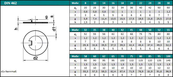 Шайбa осигурителнa по DIN 462 с вътрешен стопор или вътрешен зъб за гайка, секторна по DIN 1804 е от гамата на заключващи шайби. Намира широко инженерно приложение за осигуряване на сглобката при монтаж, против саморазвиване. Произвежданите размери са за резбови детайли от M8, като M100 е най-големият. Материалите включват стомана и неръждаема стомана. Предлага се в цялата гама от антикорозионни покрития.