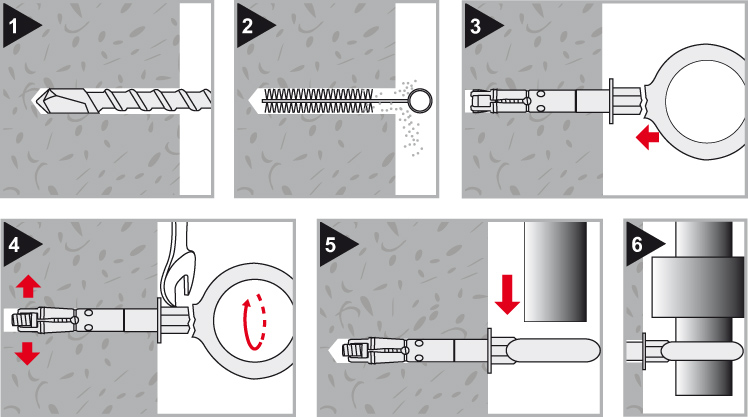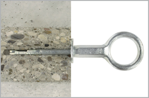 Комплект за монтаж на тръбно скеле. Състои се от стоманизирана затворена кука с отвор ф50 и анкер тип "FM744". Подходящ за плътни основи като бетон,камък и частично добър в плътна тухла.