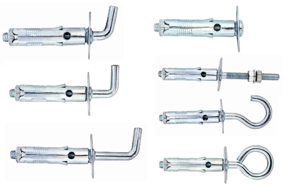 Метален дюбел комплект с различни видове куки с метрична резба(затворена,отворена,90*).Подходящ за монтаж в плътни основи(бетон,камък,плътна тухла) и частично добър в кухини.